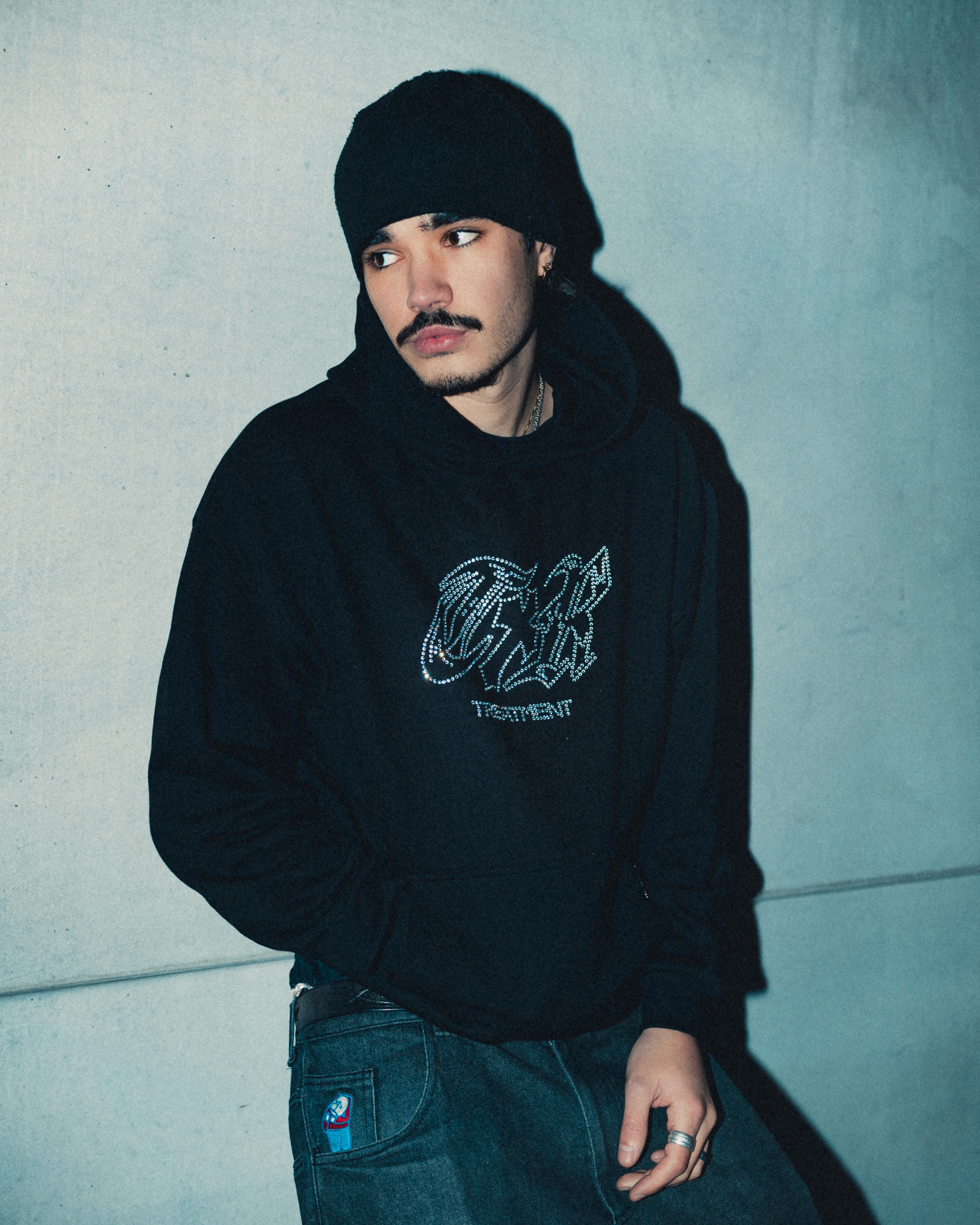 Las prendas, aún no disponibles a la venta, destacan por acabados brillantes y una identidad visual marcada. La sesión se planteó desde una estética de flash directo y planos cercanos, enfatizando reflejos y texturas para elevar el logotipo y dotar a las imágenes de un carácter contundente, sofisticado y actual.